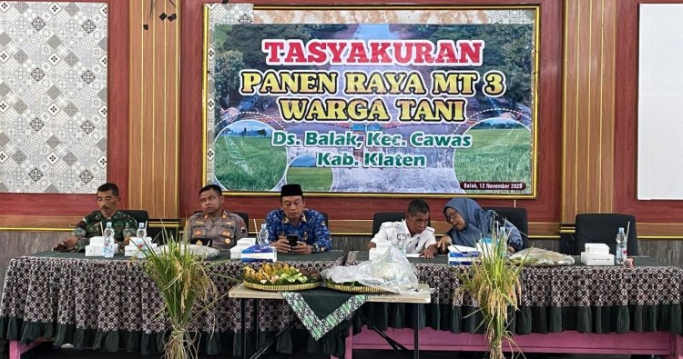 KLATEN — Bertempat di Aula Balai Desa Balak Kecamatan Cawas Kabupaten Klaten, telah dilaksanakan kegiatan Tasyakuran Panen Raya Musim Tanam (MT) 3) warga tani Desa Balak. Rabu (12/11/2025)
